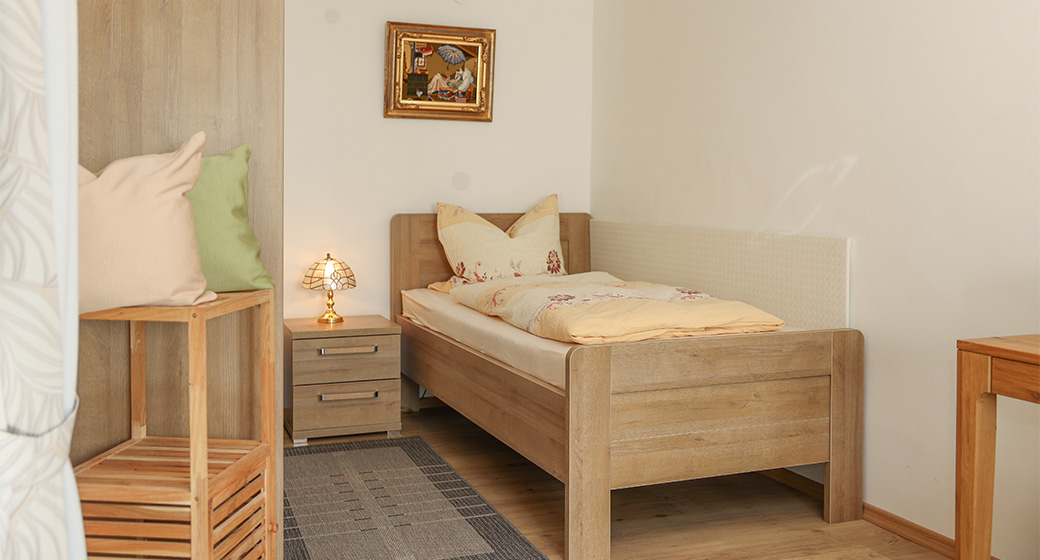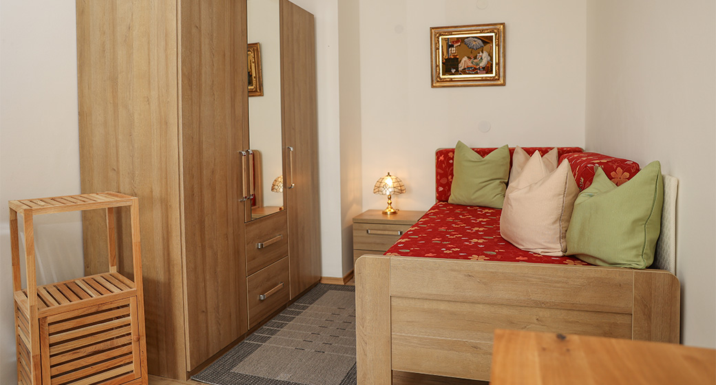 matratzen und Daunenbetten ausgestattet ist, finden Sie auch eine “Ruheecke” mit Sessel und Tischchen. Gleich daneben befindet sich der Ausgang zum Balkon auf dem Sie den Bergausblick genießen können. Auf Wunsch stellen wir auch gerne Allergikerbetten zur Verfügung.